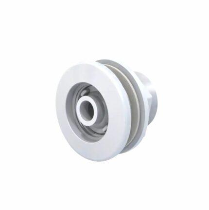 Retorno orientable Vulcano para piscina de fibra de vidrio. Posee aro desmontable blanco, cuerpo con rosca hembra de 1 1/2" y boquilla esférica con pico de ø19 mm para ser instalado por debajo del nivel de agua. Diseñado para producir flujo en dirección al skimmer o toma de fondo, y así, favorecer a la limpieza y filtrado de la pileta.