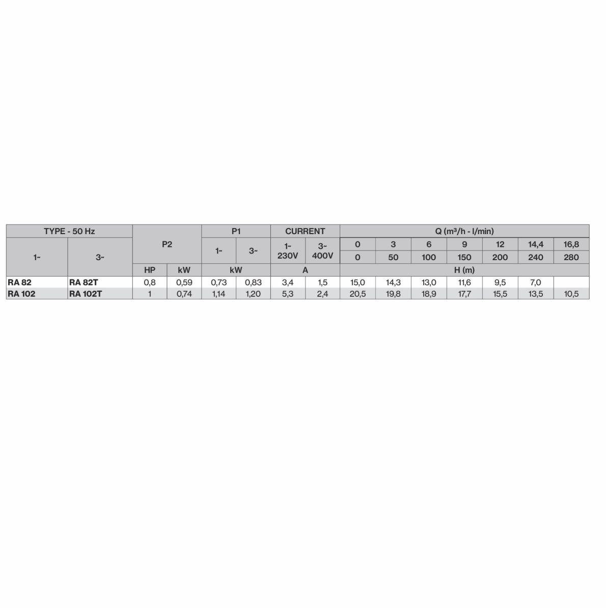 RA100/1T 1HP TRIF. BRONCE ,RA100T 1 HP TRIF. FUNDICION ,RA80/1T 0.8HP TRIF.BRONCE |